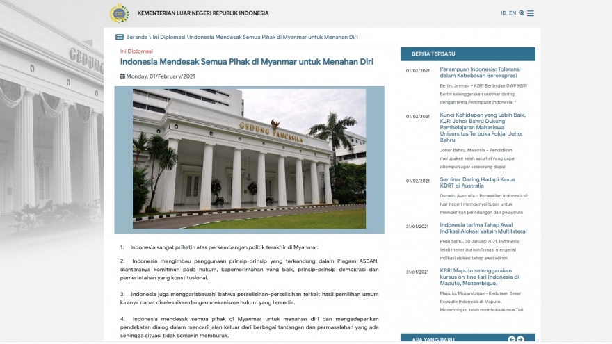 VOV.VN - Ngay sau chính biến ở Myanmar xảy ra khi quân đội nước này bắt giữ các quan chức cấp cao với cáo buộc gian lận bầu cử, Indonesia đã kêu gọi các bên liên quan kiềm chế, trong khi Philippines cho rằng đây là việc nội bộ của Myanmar.