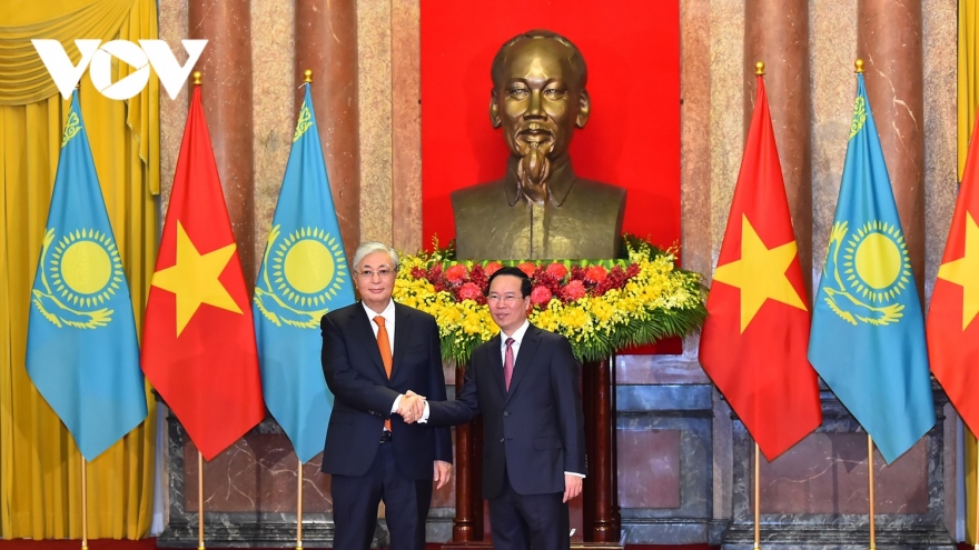 VOV.VN - Sáng 21/8, tại Phủ Chủ tịch, Chủ tịch nước Võ Văn Thưởng chủ trì lễ đón trọng thể Tổng thống Kazakhstan Kassym - Jomart Tokayev thăm chính thức Việt Nam ngày 20-22/8.