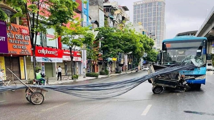 VOV.VN - Nhiều cây phi sắt xây dựng trên xe công nông tự chế đã đâm thủng buồng lái xe buýt trong lúc va chạm giao thông trên đường Nguyễn Trãi (quận Thanh Xuân, TP. Hà Nội).