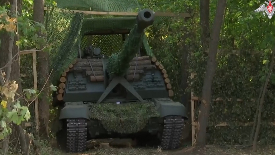 VOV.VN - Được ngụy trang kỹ càng bằng lớp lá, được bảo vệ bằng lồng sắt chống UAV, lựu pháo Mssta-S của Nga bắn dồn dập vào các vị trí của quân đội Ukraine trên hướng Kupyansk.