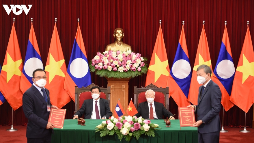 VOV.VN - Tổng Bí thư Nguyễn Phú Trọng và Tổng Bí thư, Chủ tịch nước Thongloun Sisoulith đã chứng kiến lễ ký kết và trao các văn kiện hợp tác, trong đó có Thỏa thuận Chiến lược hợp tác Việt Nam - Lào giai đoạn 2021-2030.