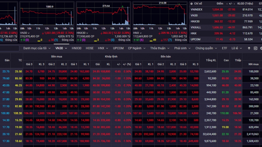 VOV.VN - Thị trường rực lửa cùng thanh khoản gia tăng cho thấy tâm lý hoảng loạn của nhà đầu tư, từ thận trọng chuyển sang trạng thái bán tháo trên thị trường, hàng loạt mã giảm giá khiến VN-Index “bốc hơi” 28 điểm về mốc 1.054,28 điểm.