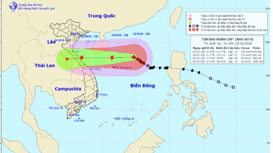 VOV.VN - Theo Trung tâm Dự báo Khí tượng Thủy văn Quốc gia, 24 giờ tới, bão số 9 di chuyển theo hướng Tây Tây Bắc tiến vào đất liền các tỉnh miền Trung, sức gió mạnh nhất giật cấp 17.