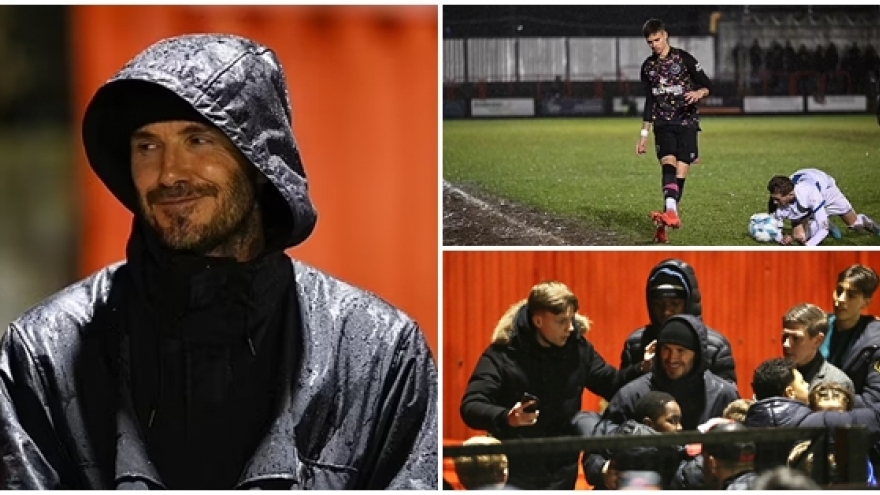 VOV.VN - David Beckham phải trèo qua hàng vào để rời sân vận động khi bị "fan quây" trong lúc đi xem trận đấu ra mắt đội Brentford B của cậu con trai Romeo Beckham.