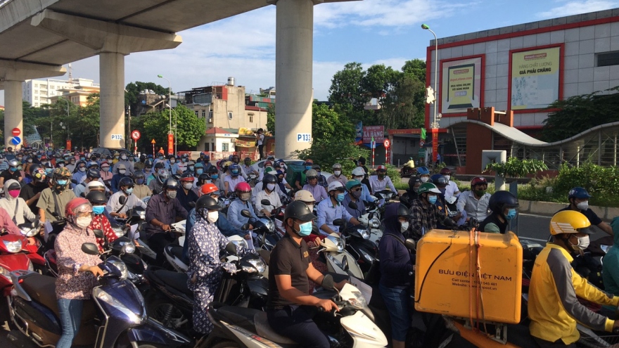 VOV.VN - Hôm nay (6/9), là ngày đầu tiên của đợt giãn cách xã hội lần 4 tại Hà Nội và cũng là ngày đầu tiên thực hiện phân vùng chống dịch. Tại chốt kiểm soát ở Cầu Diễn - vị trí đường 32 (Nam Từ Liêm), hướng vào nội đô đông đúc, ùn ứ nghiêm trọng.