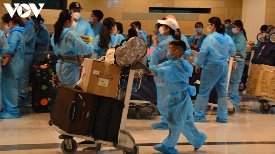VOV.VN - Sau khi máy bay hạ cánh, tất cả công dân được Ban Chỉ đạo phòng, chống dịch Covid-19 Quân khu 9 điều 16 xe ô tô đưa về khu cách ly tại Cần Thơ và Tiền Giang.