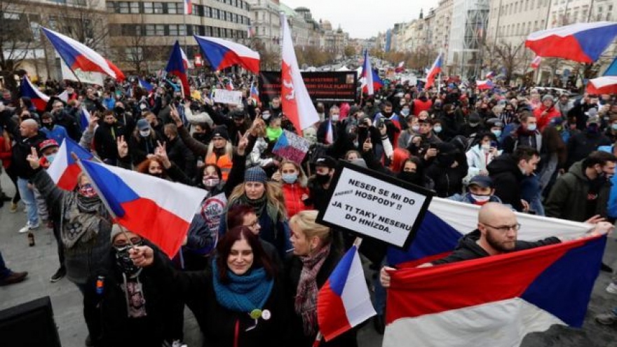 VOV.VN - Hàng trăm người biểu tình trong đó có nhiều người không đeo khẩu trang, đã tụ tập tại Quảng trường Con ngựa ở Praha, vào chiều thứ Ba để biểu tình phản đối các biện pháp hạn chế của Chính phủ Séc nhằm hạn chế sự lây lan của Covid-19.