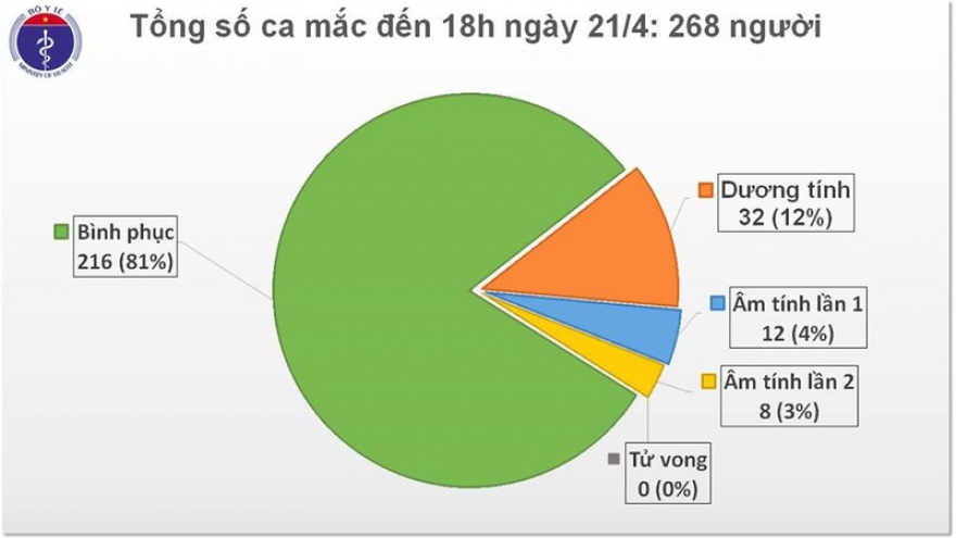 VOV.VN -Theo Bộ Y tế, đến 18h chiều 21/4, Việt Nam tiếp tục ghi nhận không có ca mắc Covid-19 mới. Hiện tổng số ca mắc tại thời điểm này vẫn là 268 ca.