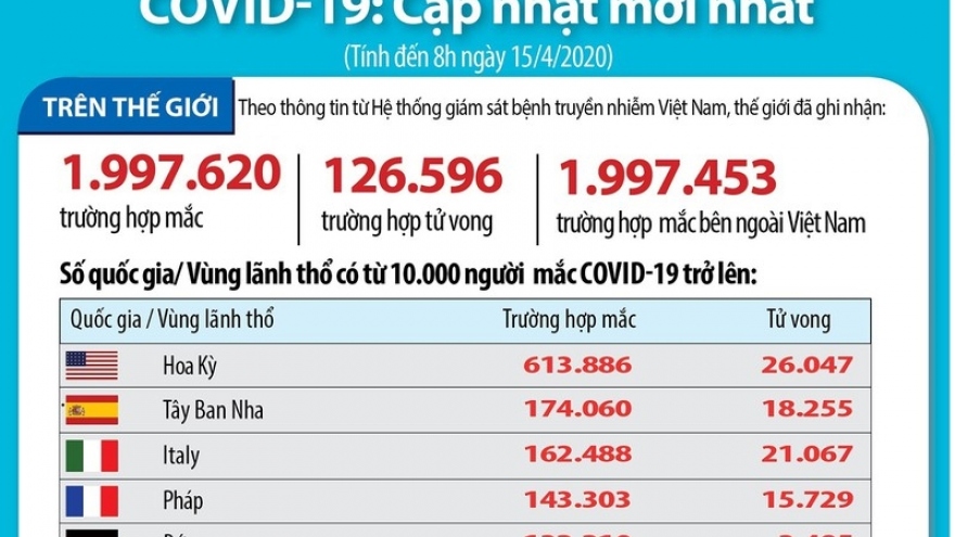 VOV.VN - Tính đến 8h ngày 15/4, thế giới có 1.997.620 ca mắc và 126.596 ca tử vong vì Covid-19. Mỹ vẫn đứng đầu với 613.886 ca mắc và 26.047 ca tử vong.