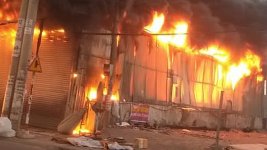 VOV.VN - Sáng nay (14/1), tại phường An Phú, thành phố Thuận An, tỉnh Bình Dương xảy ra vụ cháy lớn thiêu rụi cửa hàng bán xe máy và 1 phần cửa hàng bán giày.