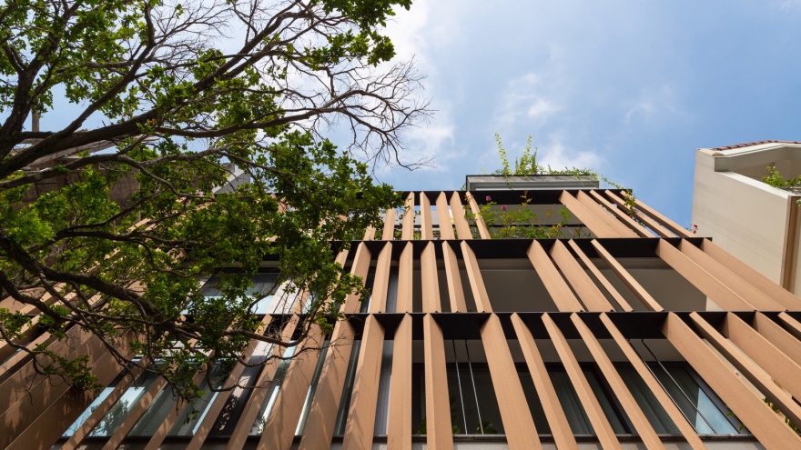 VOV.VN - Để tránh sự lặp đi lặp lại của những ngôi nhà phố phân lô, nhà liền kề, chủ nhân ngôi nhà đã chọn trang trí cửa lá sách cho mặt tiền, tạo sự ấn tượng.