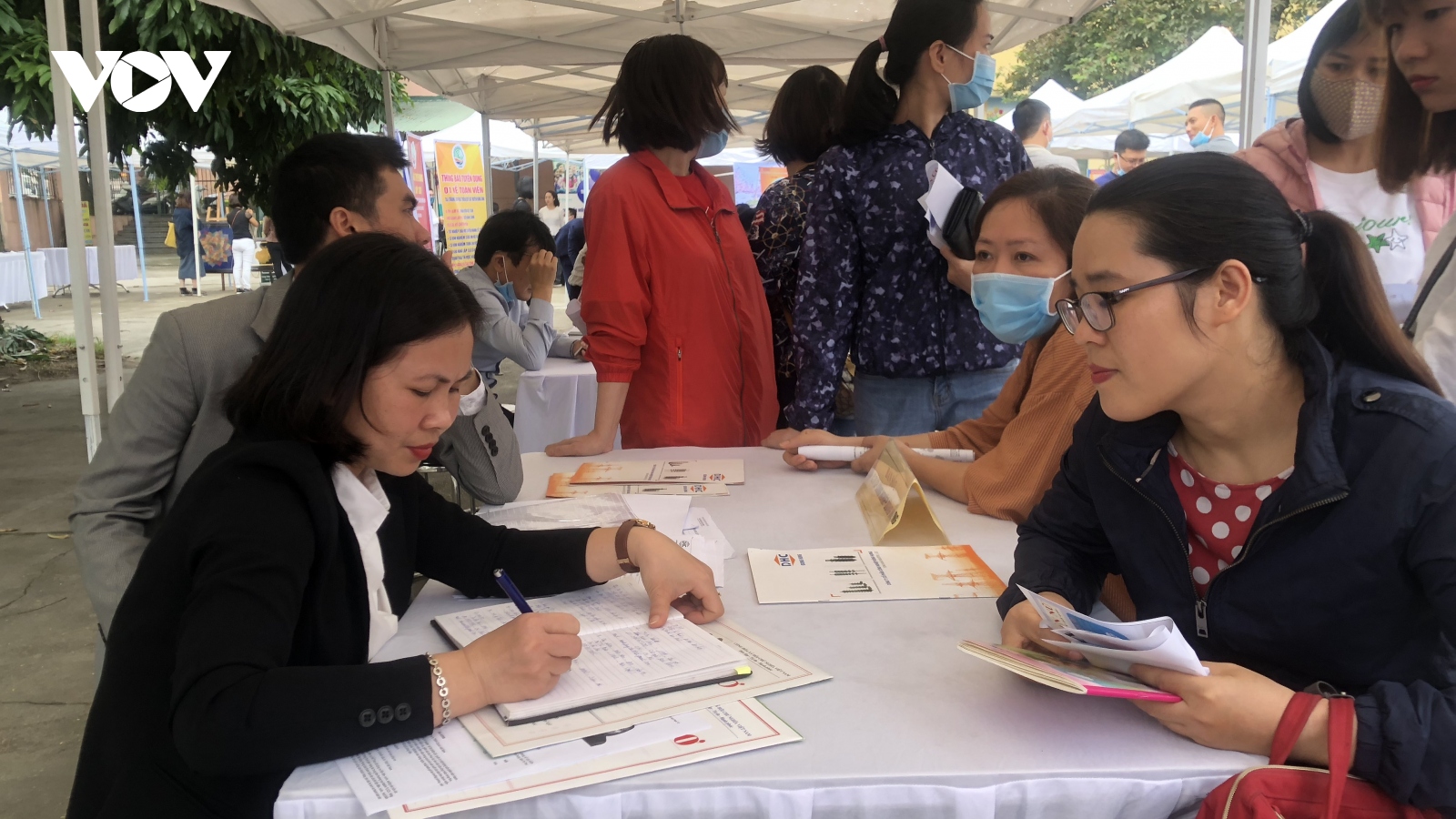 VOV.VN - Trong phiên giao dịch việc làm cuối tuần tổ chức tại quận Long Biên, Hà Nội có hơn 70 doanh nghiệp tham gia, tuyển dụng 2.300 vị trí việc làm, với mức lương khởi điểm từ 5 - 15 triệu đồng/tháng.
