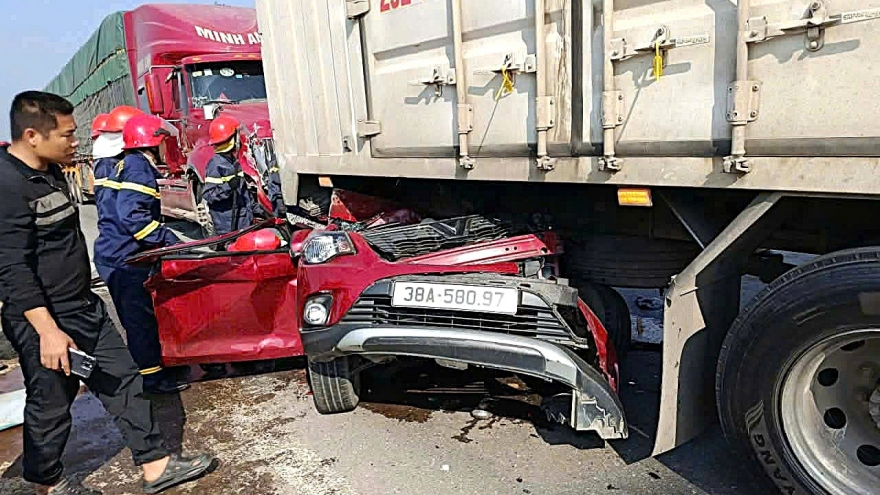 VOV.VN - Ô tô con màu đỏ chở 3 người bị hư hỏng nặng, mắc kẹt vào gầm xe container trong vụ tai nạn liên hoàn xảy ra trên quốc lộ 1A ở tỉnh Hà Tĩnh, sáng 12/1.