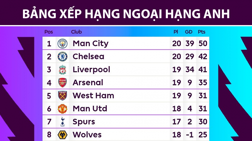 Bảng xếp hạng Ngoại hạng Anh mới nhất: Tottenham vững tốp 4, MU và Arsenal xa dần giấc mơ