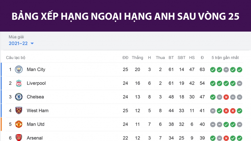 VOV.VN - Cập nhật bảng xếp hạng Ngoại hạng Anh 2021/2022 mới nhất đến sáng 10/4, Tottenham củng cố chắc vị trí thứ 4, Arsenal và MU xa dần giấc mơ dự Cúp C1 châu Âu mùa giải năm sau.