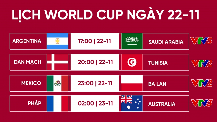VOV.VN - Lịch thi đấu World Cup 2022 hôm nay 22/11 và rạng sáng 23/11, Argentina sẽ ra sân ở khung giờ thuận lợi cho khán giả Việt Nam theo dõi, còn ĐKVĐ Pháp sẽ khởi đầu hành trình bảo vệ danh hiệu.