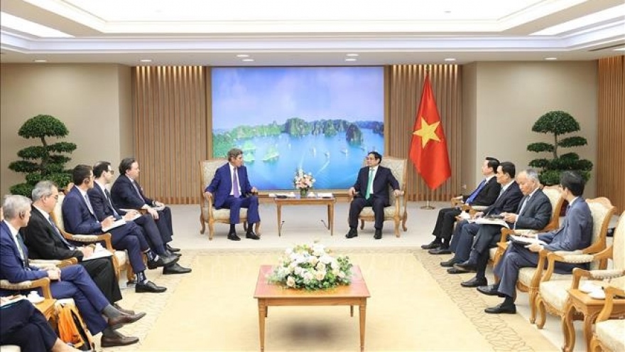 VOV.VN - Chiều 5/9, tại trụ sở Chính phủ, Thủ tướng Chính phủ Phạm Minh Chính đã tiếp Đặc phái viên của Tổng thống Hoa Kỳ về biến đổi khí hậu John Kerry thăm làm việc tại Việt Nam.