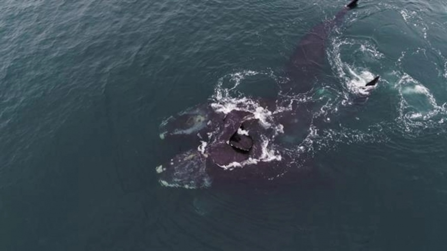VOV.VN - Hai chú cá voi Fiddle và Hyphen ở Bắc Đại Tây Dương bơi cùng nhau một cách thân mật, giống như đang “ôm” nhau. Những khoảnh khắc thân mật như thế này có thể bắt gặp trong giai đoạn giao phối, những lúc chơi đùa của cá voi hoặc giữa cá voi mẹ và cá voi con.
