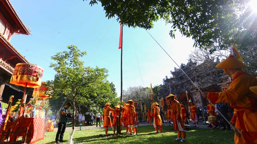 VOV.VN - Sáng nay (14/1), tại Đại Nội Huế, Trung tâm Bảo tồn di tích Cố đô Huế tổ chức nghi lễ thượng nêu theo phong tục cung đình ngày xưa của triều Nguyễn vào dịp Tết Nguyên đán.