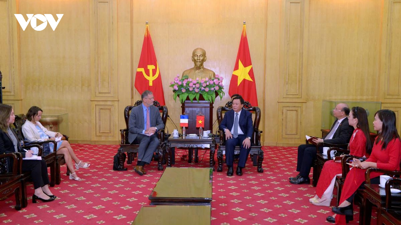 VOV.VN - Sáng 25/9, tại Hà Nội, ông Nguyễn Xuân Thắng, Ủy viên Bộ Chính trị, Giám đốc Học viện Chính trị quốc gia Hồ Chí Minh, Chủ tịch Hội đồng Lý luận Trung ương chủ trì buổi tiếp, làm việc với Đại sứ Pháp tại Việt Nam Olivier Brochet.