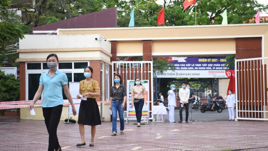 VOV.VN - Các công đoạn từ kiểm tra thân nhiệt, sát khuẩn và hướng dẫn cử tri giữ khoảng cách tại điểm bỏ phiếu ở Hải Phòng được thực hiện nhịp nhàng, đảm bảo an toàn cho ngày bầu cử đại biểu Quốc hội và đại biểu HĐND các cấp.