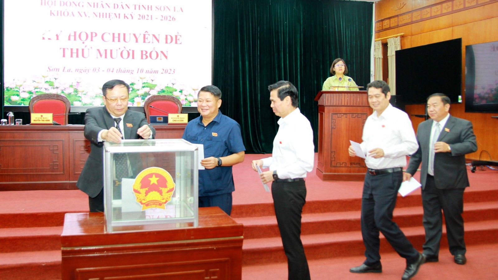 VOV.VN - 28 người giữ chức vụ do HĐND tỉnh Sơn La khoá XV bầu với kết quả tín nhiệm cao chiếm ưu thế - Đây là kết quả lấy phiếu tín nhiệm tại Kỳ họp chuyên đề lần thứ 14, HĐND tỉnh Sơn La khóa XV, nhiệm kỳ 2021-2026, tổ chức hôm nay 4/10.