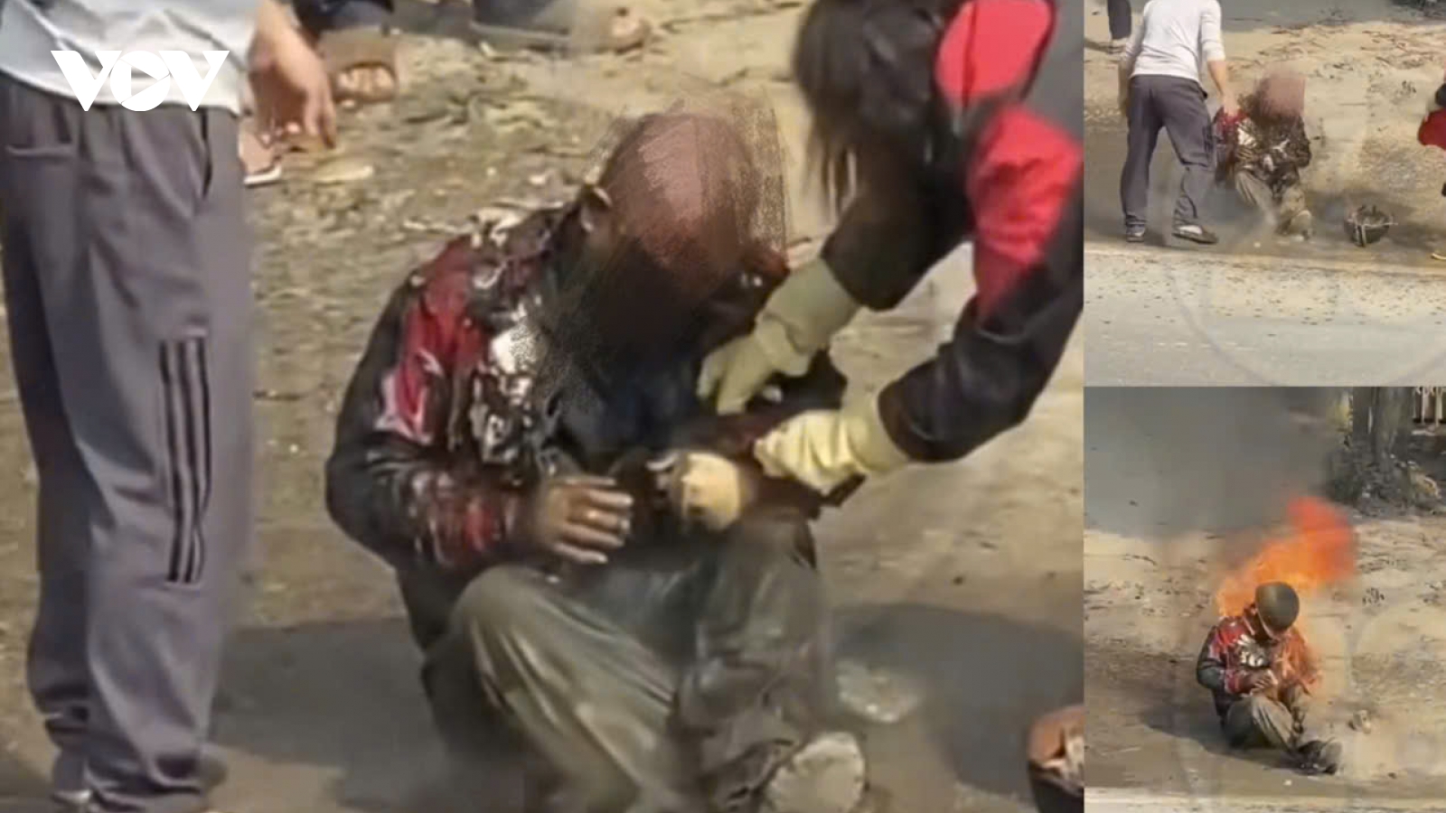VOV.VN - Người đàn ông khi đang đi trên đường ở Hòa Bình thì ngồi xuống rồi bốc cháy sau đó. Nhận định ban đầu có thể nạn nhân tẩm xăng rồi châm lửa tự thiêu.