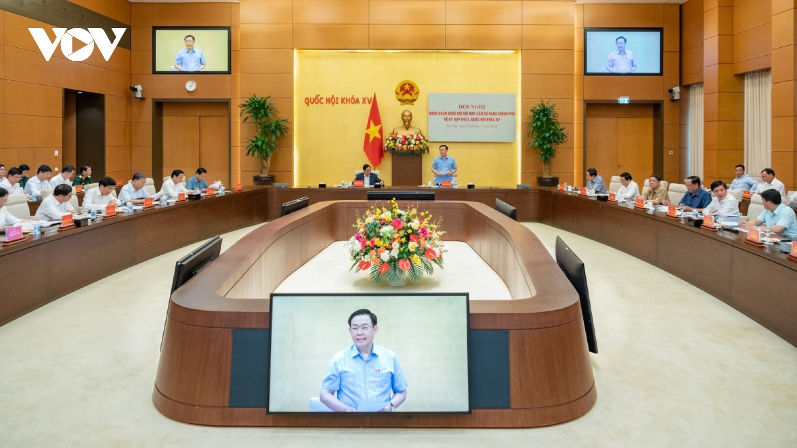 VOV.VN - Chiều 18/5, tại Nhà Quốc hội, Bí thư Đảng đoàn Quốc hội, Chủ tịch Quốc hội Vương Đình Huệ và Bí thư Ban cán sự Đảng Chính phủ, Thủ tướng Chính phủ Phạm Minh Chính đồng chủ trì hội nghị giữa Đảng đoàn Quốc hội và Ban cán sự Đảng Chính phủ về Kỳ họp thứ Năm, Quốc hội Khoá XV.