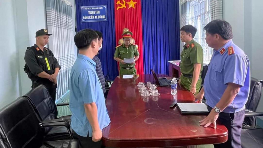 VOV.VN - Cơ quan Cảnh sát điều tra, Công an tỉnh Quảng Ngãi vừa tống đạt quyết định khởi tố vụ án hình sự, khởi tố 3 bị can về tội nhận hối lộ xảy ra tại Trung tâm đăng kiểm xe cơ giới Quảng Ngãi 76-01S.