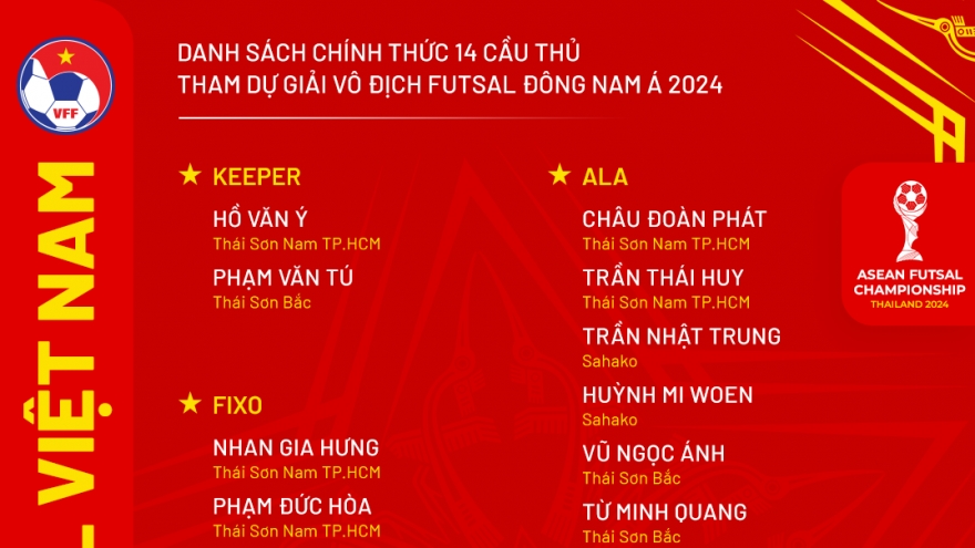 VOV.VN - Ngày 30/10, HLV trưởng Giustozzi Diego đã chốt 14 cầu thủ vào danh sách chính thức của ĐT Futsal Việt Nam tham dự giải vô địch Futsal Đông Nam Á 2024.