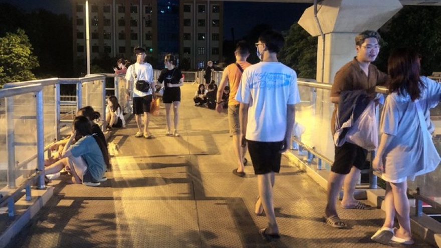 Nhiều người trẻ đang biến những cây cầu vượt đi bộ bắc ngang qua các trục đường lớn tại Hà Nội thành… tụ điểm vui chơi buổi tối. Có thời điểm, số người tụ tập trên cầu đông đến mức gây cản trở việc đi lại của những người muốn qua đường.