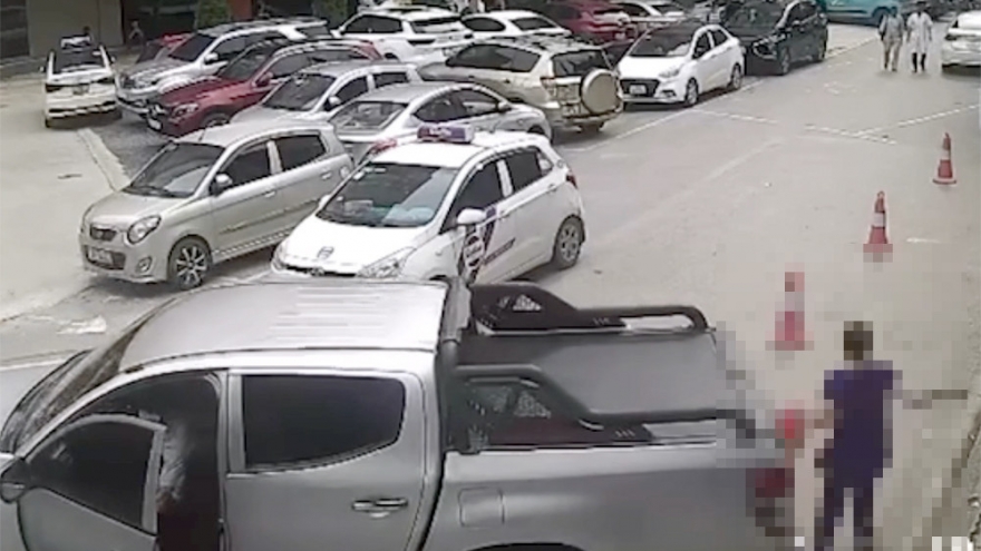 Đoạn clip ghi lại cảnh xe ô tô bán tải bất ngờ lùi, cán qua một phụ nữ đi bộ tại khuôn viên Bệnh viện Đa khoa Hà Đông (phường Quang Trung, quận Hà Đông, Hà Nội).