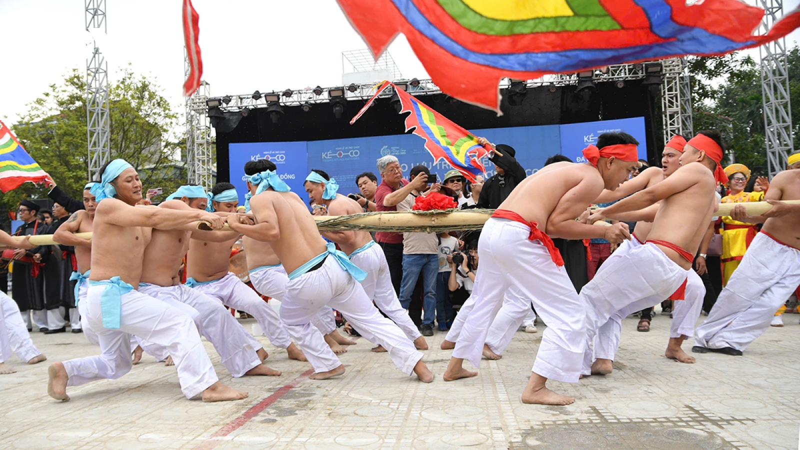 Trai tráng cởi trần trình diễn nghi lễ và trò chơi kéo co tại Hà Nội