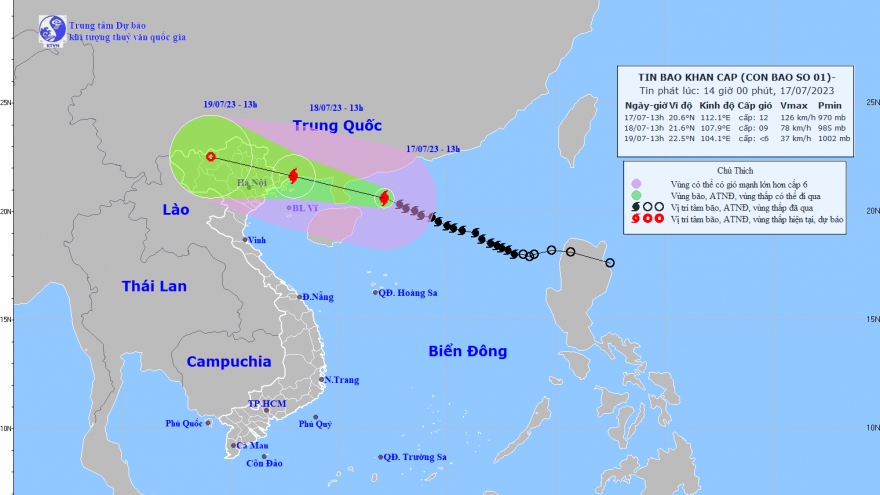VOV.VN - Hồi 13h ngày 17/7, vị trí tâm bão cách Móng Cái (Quảng Ninh) khoảng 480km về phía Đông Đông Nam. Sức gió mạnh nhất vùng gần tâm bão mạnh cấp 12 (118-133km/giờ), giật cấp 15.