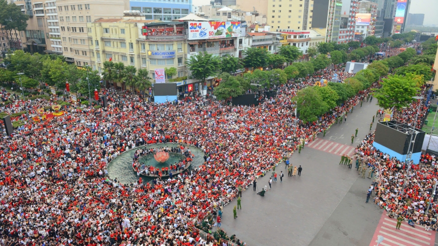 VOV.VN - Tại các tuyến đường Võ Văn Tần, Nam Kỳ Khởi Nghĩa, Nguyễn Đình Chiểu,...(TP.HCM), hàng vạn người dân mặc áo cờ đỏ, sao vàng, tay cầm cờ Tổ quốc đã "nhuộm đỏ" các ngả đường có đoàn diễu binh, diễu hành đi qua với một tâm thế háo hức, tự hào.