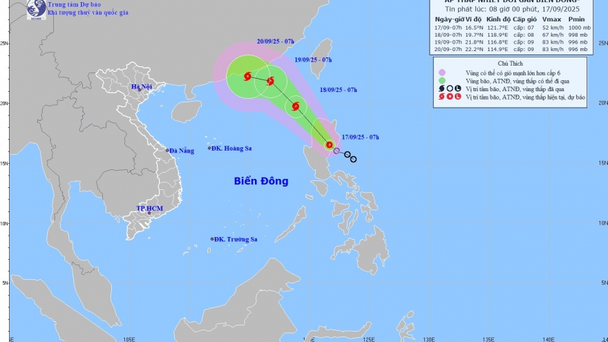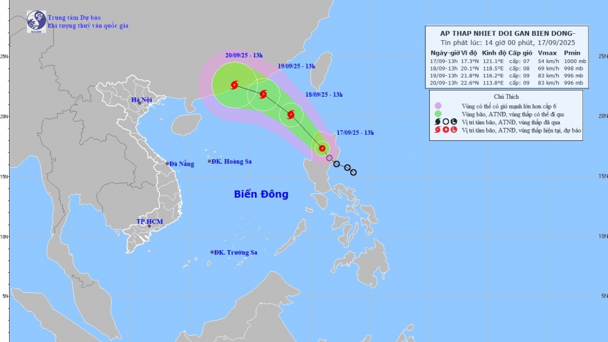 VOV.VN - Theo Trung tâm dự báo Khí tượng Thủy văn quốc gia, hồi 13h ngày 17/9, tâm áp thấp nhiệt đới ở trên khu vực phía Tây Bắc đảo Luzon (Philippines). Sức gió mạnh nhất gần tâm áp thấp nhiệt đới mạnh cấp 7 (50–61km/h), giật cấp 9. Áp thấp di chuyển theo hướng Tây Bắc, tốc độ khoảng 15km/h.