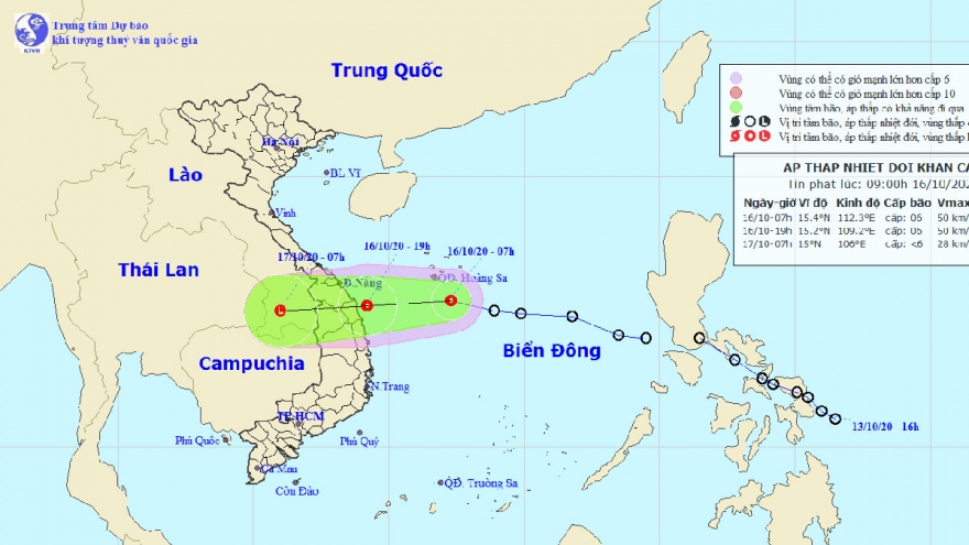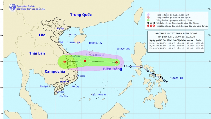 VOV.VN - Chiều tối 15/10, áp thấp nhiệt đới vượt qua Philippines vào Biển Đông, cách đảo Song Tử Tây khoảng 460km về phía Đông Bắc với sức gió mạnh nhất 50 km/h, giật cấp 8.