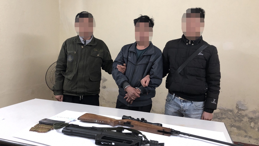 VOV.VN - Đối tượng bị bắt là Tráng A Lầu, sinh năm 1981, trú tại bản Lũng Xá, xã Lóng Luông, huyện Vân Hồ, tỉnh Sơn La. Tang vật thu giữ gồm 2 khẩu súng, 1 hộp tiếp đạn, 27 viên đạn.