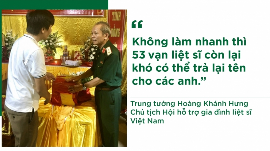 VOV.VN - "Mặc dù chiến tranh đã lùi xa gần 50 năm nhưng đến giờ phút này vẫn còn 53 vạn liệt sĩ chưa biết tên trong đó có hơn 22 vạn liệt sĩ đang nằm ở rừng sâu, khe lạnh, ở cả chiến trường Lào, Campuchia", Trung tướng Hoàng Khánh Hưng nghẹn ngào.