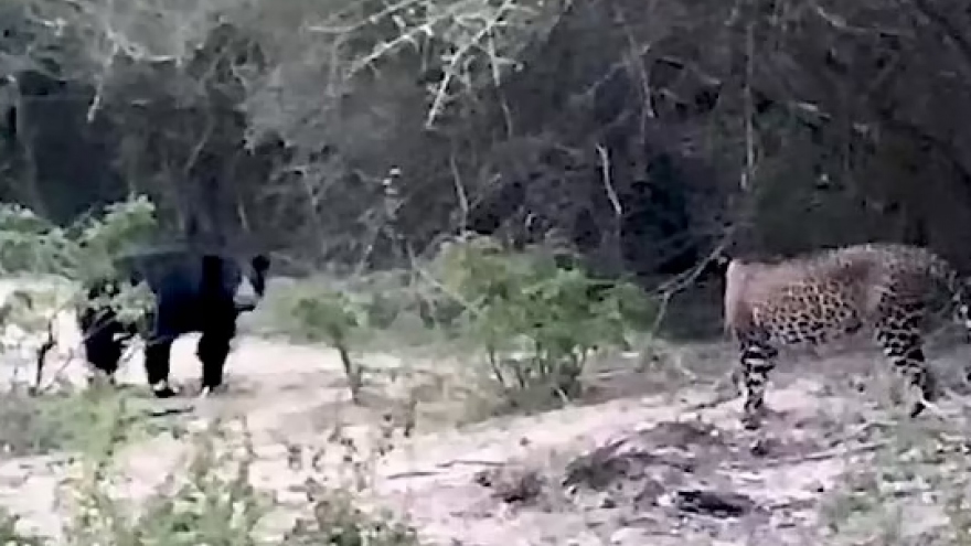 VOV.VN - Trong đoạn video, gấu đen lao về phía báo hoa mai, đứng bằng 2 chân sau để hù dọa. Tuy nhiên, báo hoa mai không hề lo sợ vẫn quyết đối đầu với đối thủ hung hãn. Sự lì lợm của đối phương khiến gấu phải bỏ cuộc.
