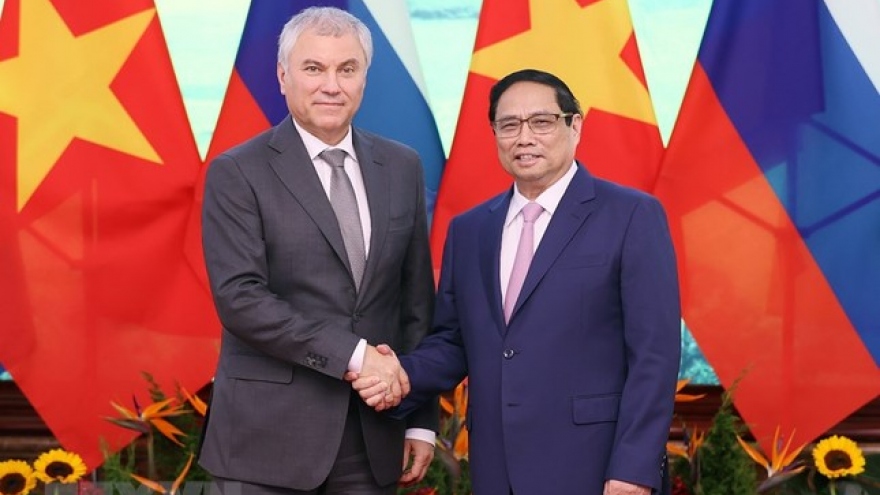 VOV.VN - Chiều 16/10, tại Trụ sở Chính phủ, Thủ tướng Chính phủ Phạm Minh Chính đã hội kiến Chủ tịch Duma Quốc gia Quốc hội Liên bang Nga Vyacheslav Volodin đang có chuyến thăm chính thức Việt Nam theo lời mời của Chủ tịch Quốc hội Vương Đình Huệ.