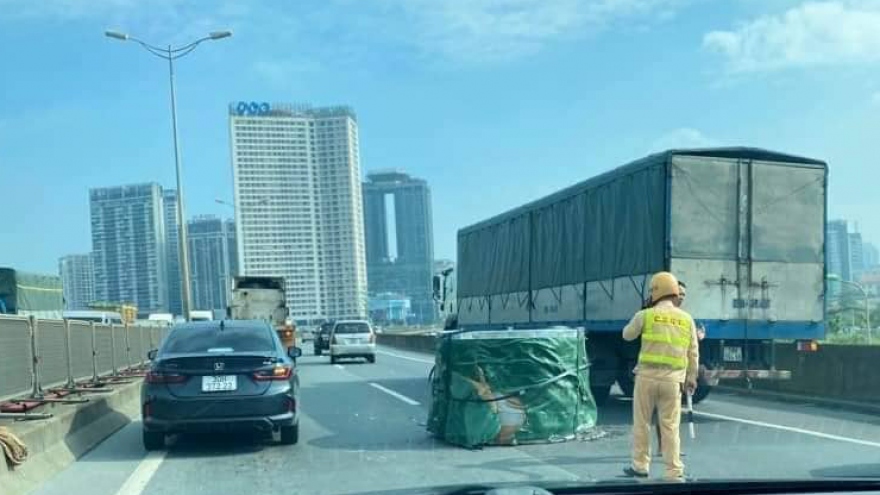 VOV.VN - Xe container chở 2 cuộn thép nặng hàng chục tấn trên đường Vành đai 3 trên cao (Hà Nội) bất ngờ lăn xuống đường khiến mặt đường bị hư hỏng, giao thông trên tuyến Vành đai 3 trên cao ùn tắc kéo dài 5km.