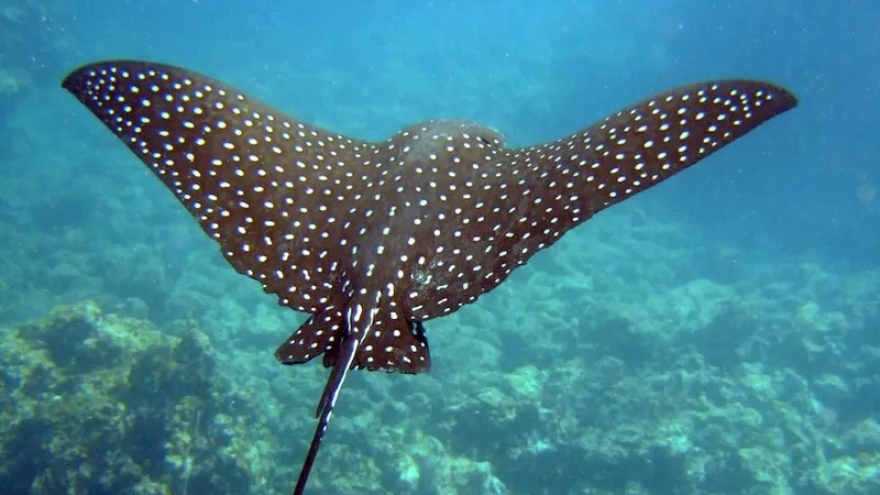 VOV.VN - Cá đuối đại bàng đốm là một trong những loài đẹp nhất trong họ cá đuối. Vẻ đẹp ấn tượng của chúng khiến nhiều người cảm thấy thích thú khi bắt gặp chúng dưới biển. Đoạn video được một nhóm thợ lặn ghi lại ở Quần đảo Galapagos, ngoài khơi Ecuador.