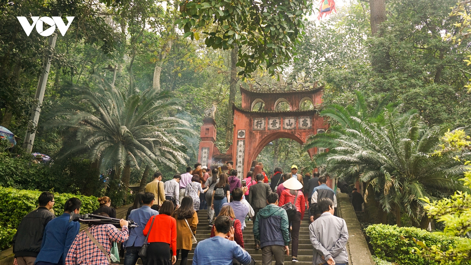 VOV.VN - Ngày 9/4, Khu Di tích lịch sử Đền Hùng thu hút rất đông du khách đến dâng hương, chiêm bái. Đường lên Đền Hùng đông đúc nhưng không có tình trạng chen lấn, xô đẩy.