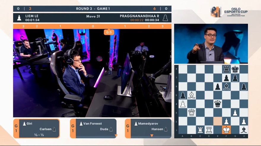 VOV.VN - Rạng sáng nay (29/4), Lê Quang Liêm đã vượt qua Jorden van Foreest với tỷ số 3,5-2,5 để có thêm 2 điểm trên bảng xếp hạng và giành ngôi á quân giải cờ vua trực tuyến Oslo Esports Cup.