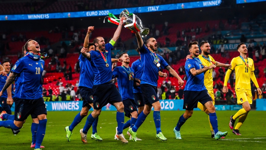 VOV.VN - Italia lần thứ 2 trong lịch sử giành chức vô địch EURO sau lần đầu tiên đăng quang vào năm 1968. Thầy trò HLV Roberto Mancini cũng là những người đầu tiên thắng 2 loạt sút luân lưu liên tiếp ở đấu trường EURO.