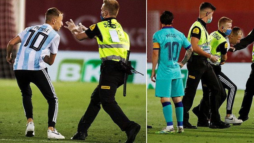 VOV.VN - Dù trận đấu giữa Mallorca và Barca diễn ra không có khán giả nhưng một fan cuồng của Lionel Messi vẫn tìm được cách lẻn vào và chạy xuống sân.
