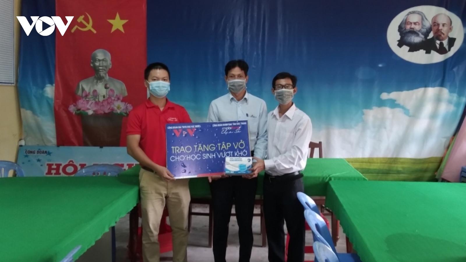 VOV.VN - Ngày 25/9, Công đoàn Cơ quan thường trú VOV tại khu vực ĐBSCL phối hợp nhà tài trợ tổ chức hoạt động trao tặng tập và khẩu trang cho học sinh nghèo, con em đồng bào dân tộc Khmer trên địa bàn tỉnh Sóc Trăng.