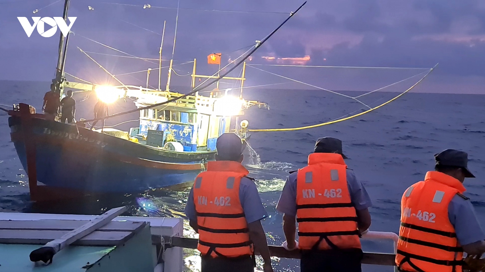 VOV.VN - Vào lúc 19h, ngày 10/02, Tàu KN 462, Chi đội Kiểm ngư số 4 đã tiếp cận và lai kéo tàu cá của ngư dân Bình Định số hiệu BĐ 96012 TS về đảo Song Tử Tây an toàn.