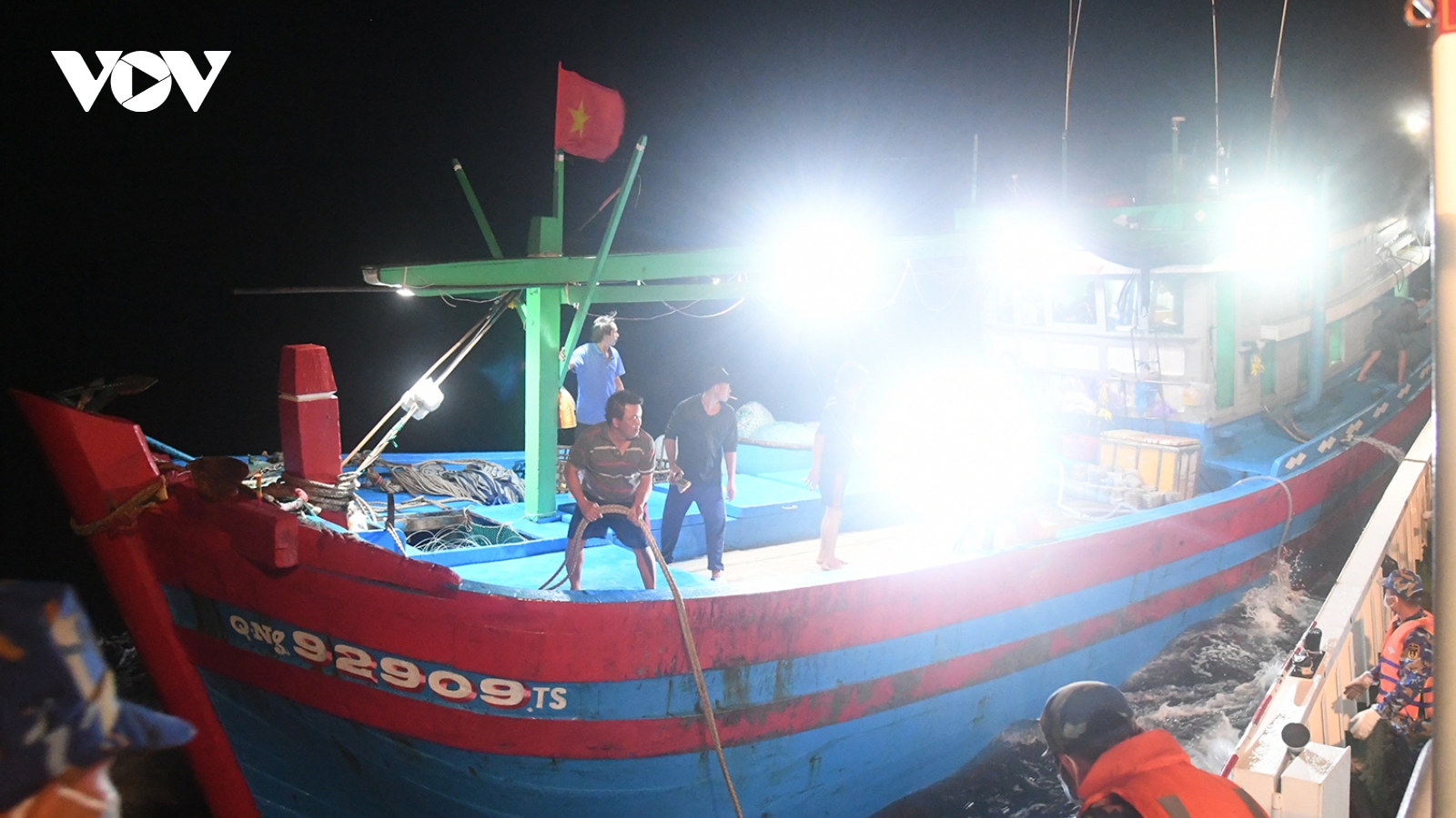 VOV.VN - Vào lúc 13 giờ ngày 20/3, cán bộ, chiến sĩ Tàu 368, Vùng 3 Hải quân đã tiếp cận và triển khai các biện pháp tổ chức lai kéo 2 tàu cá ĐNa 91095 TS và ĐNa 91282 TS về bờ để bàn giao cho cơ quan chức năng.